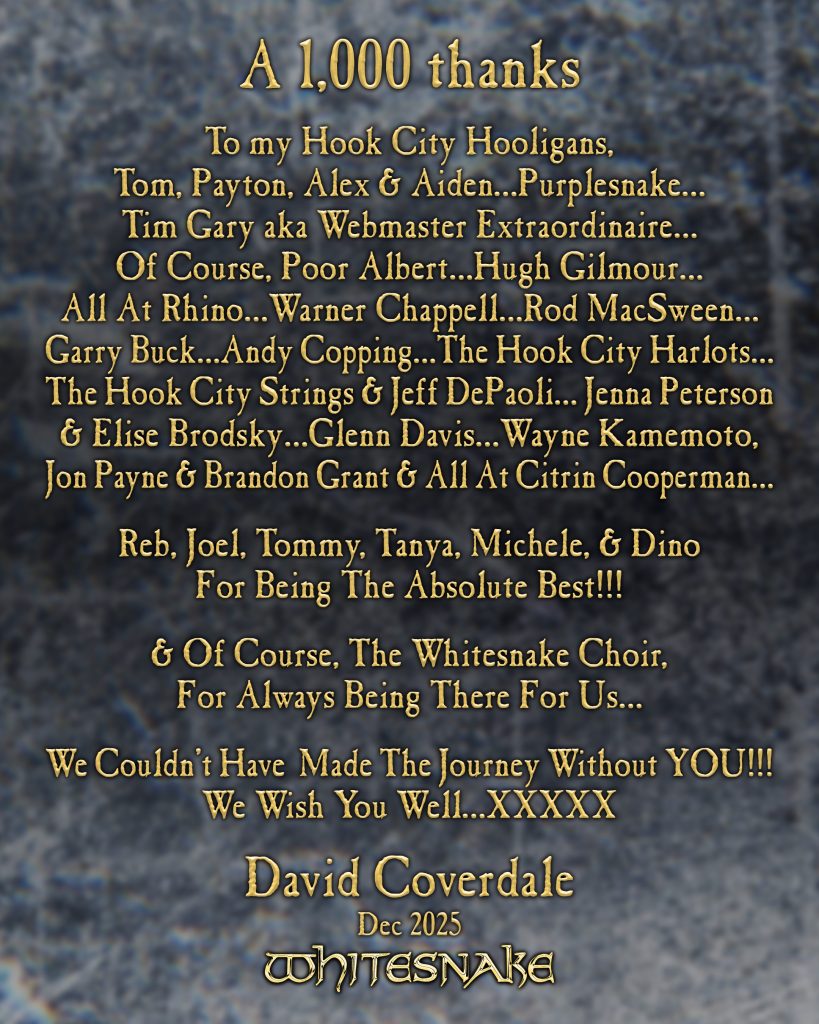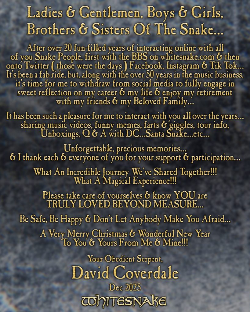 After over 20 fun-filled years of interacting online with all of you Snake People, first with the BBS on whitesnake.com & then onto Twitter ( those were the days ) Facebook, Instagram & Tik Tok…It’s been a fab ride, but, along with the over 50 years in the music business, it’s time for me to withdraw from social media to fully engage in sweet reflection on my career & my life & enjoy my retirement with my friends & my Beloved Family…